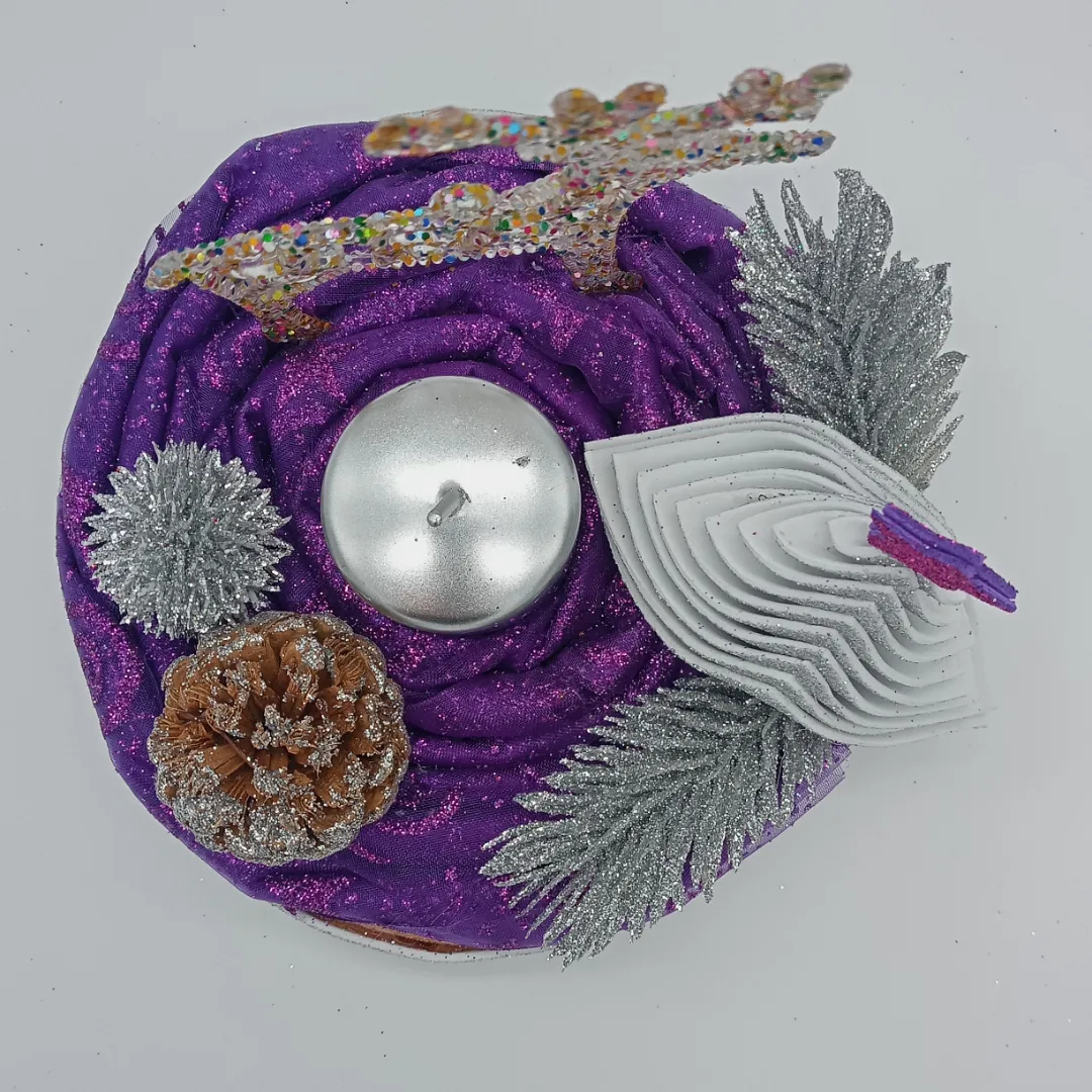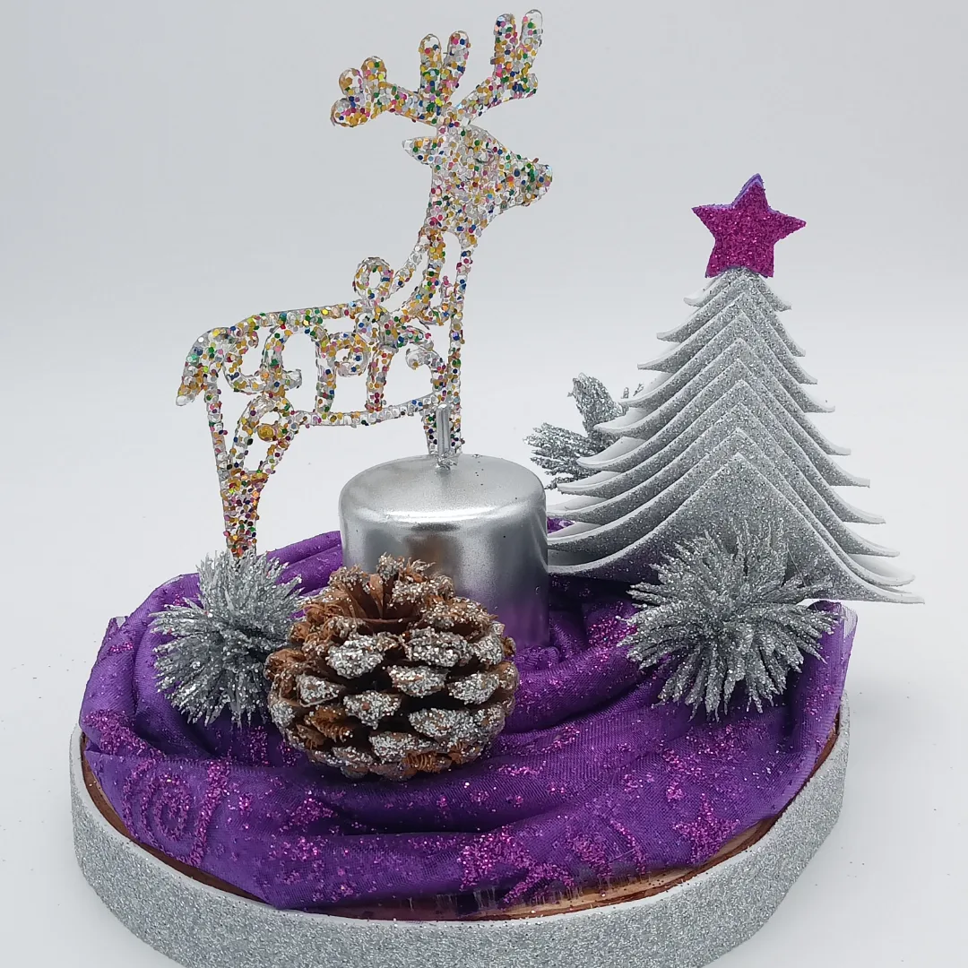 Realizzato su base in legno diametro 14,5cm rivestita sul bordo con gomma eva glitterata argento. Composto da tulle decorato viola, candela in paraffina argento, alberello in gomma eva glitterata argento, renna glitterata in plastica, una pigna decorata argento, applicazioni argento a tema.